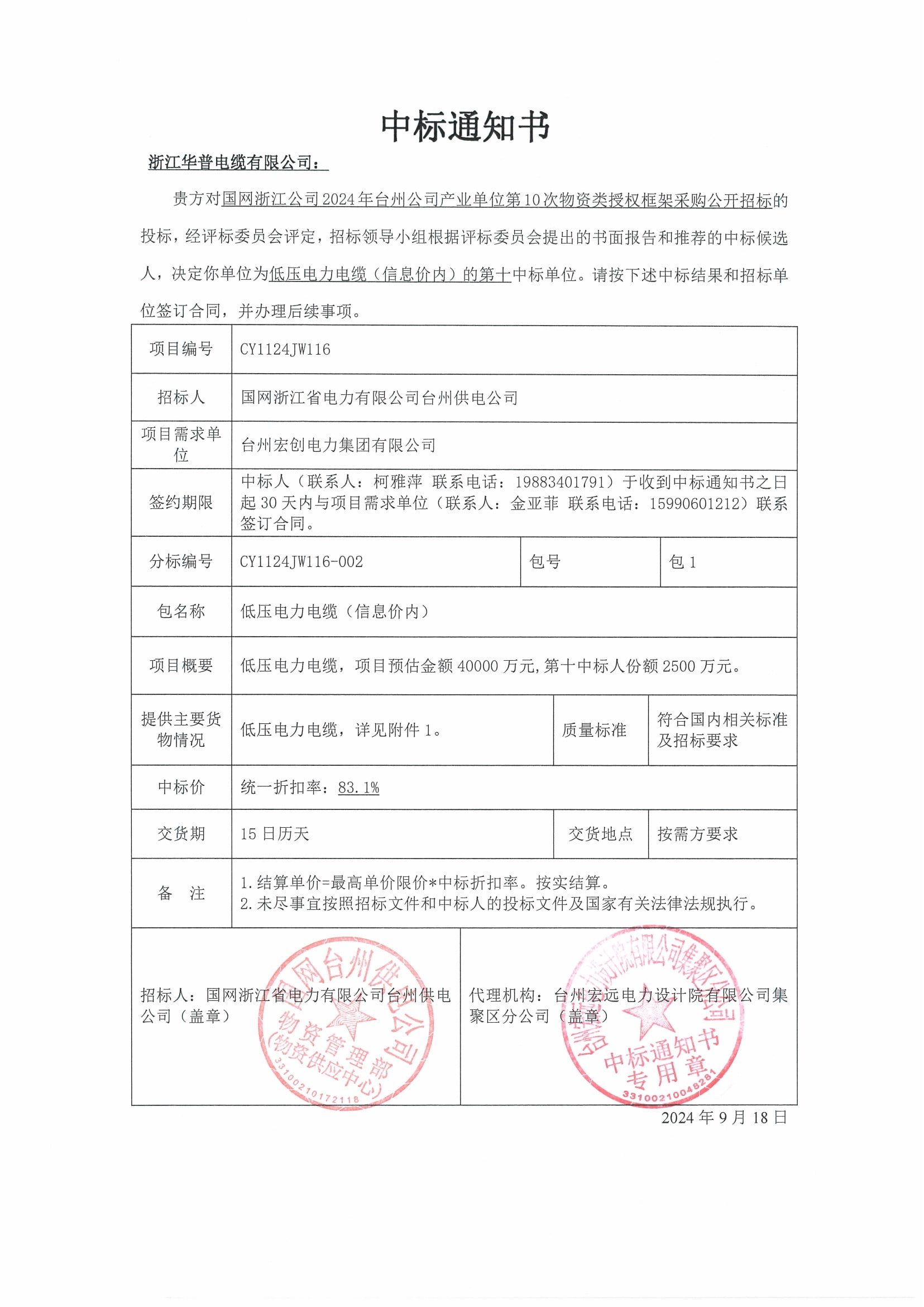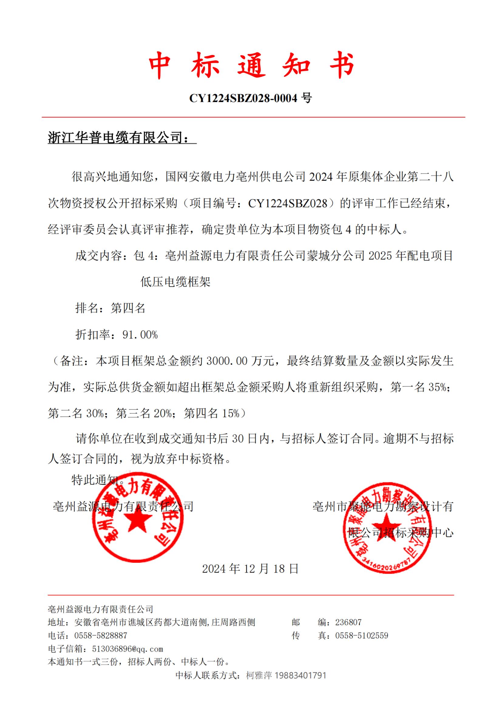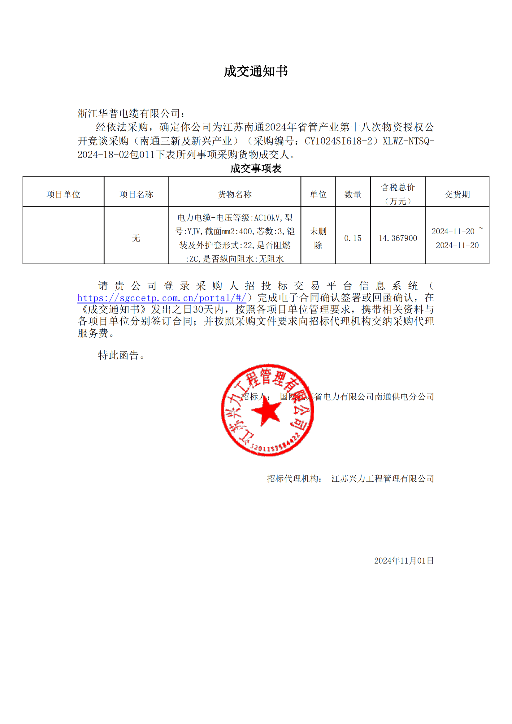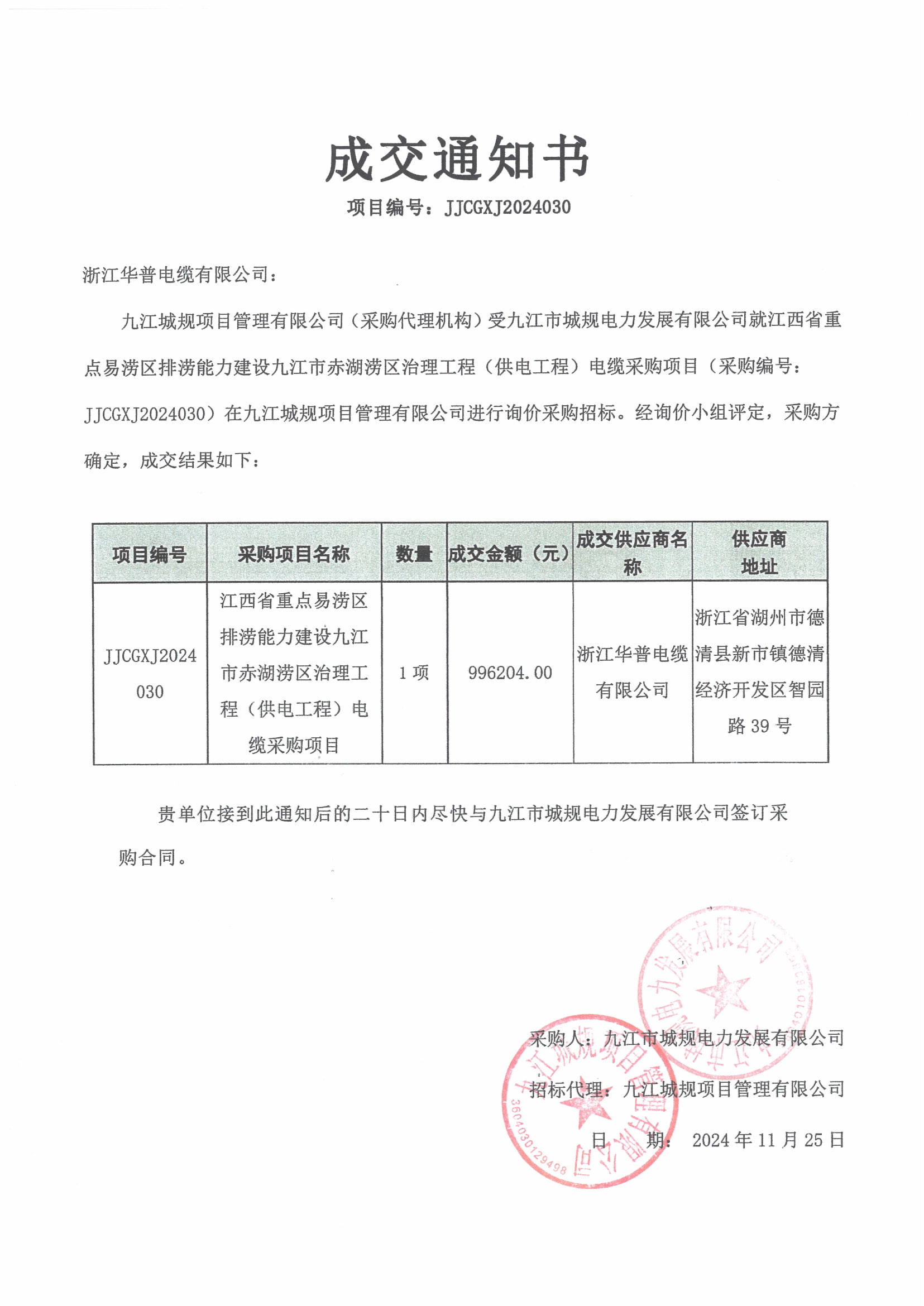(Notificación de adjudicación) Construcción de capacidad de drenaje en áreas clave propensas a inundaciones en la provincia de Jiangxi, ciudad de Jiujiang, proyecto de control de inundaciones de Chihu (proyecto de suministro de energía), adquisición de cables